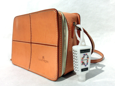 このCourregesのカバンは革製なんですが、形状がかわいくもあるので、クリアとブラックのハンドローションホルダーの両方をつけてみました。